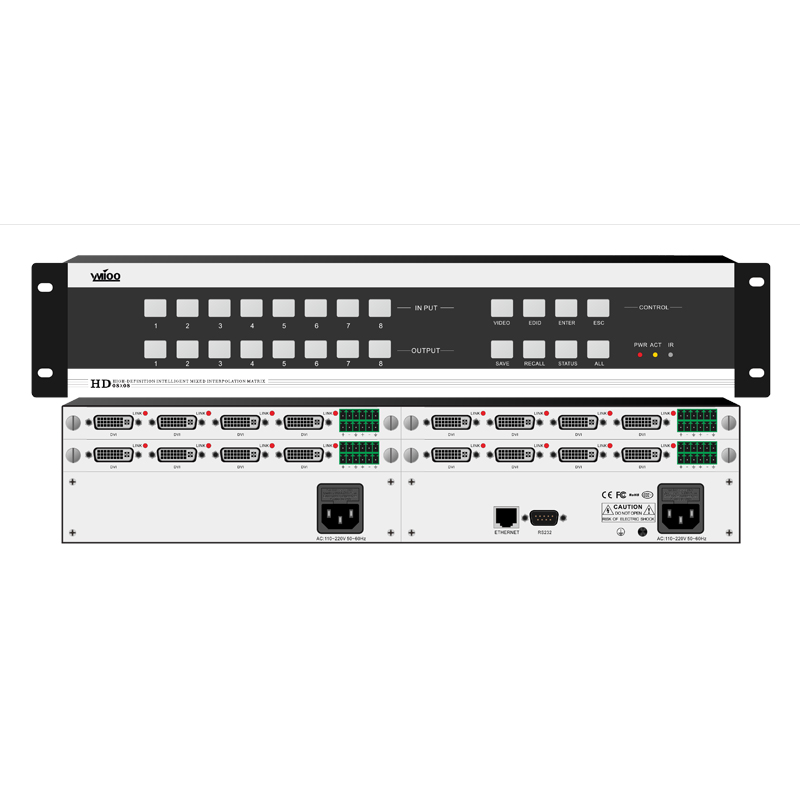 (3)音频处理能力:DVI、VGA、SDI、色差、Video输入支持模拟音频输入混合;HDMI输入支持模拟音频/数字音频选择混合;混合后的信号经切换后,支持内嵌音频输出(HDMI)、或者视频和音频分离输出(DVI、VGA、SDI等)。