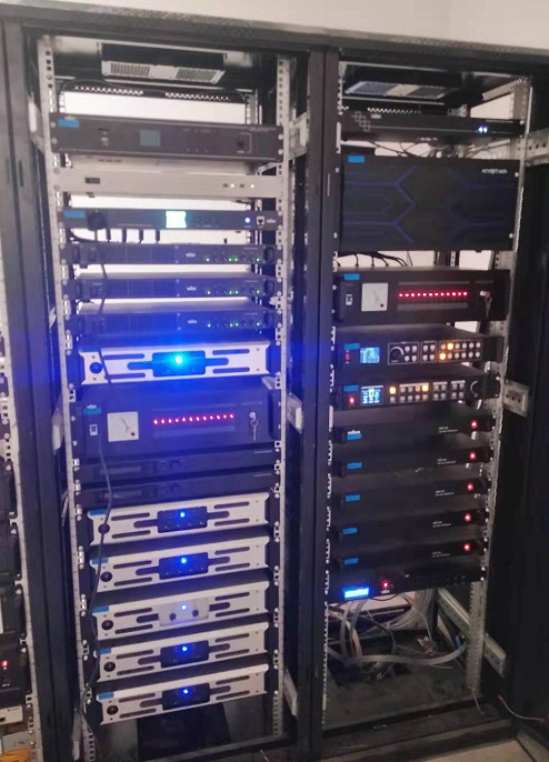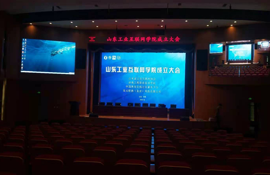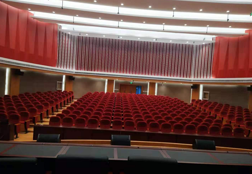 山东济南工程学院多功能报告厅主要采用 优麦全数字有线会议系统、 音频处理系统、扩声音箱系统、