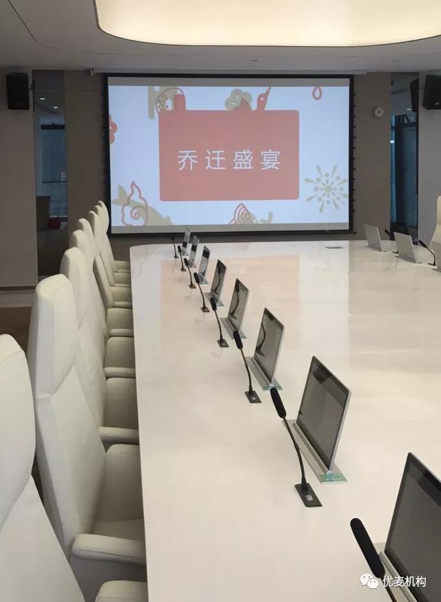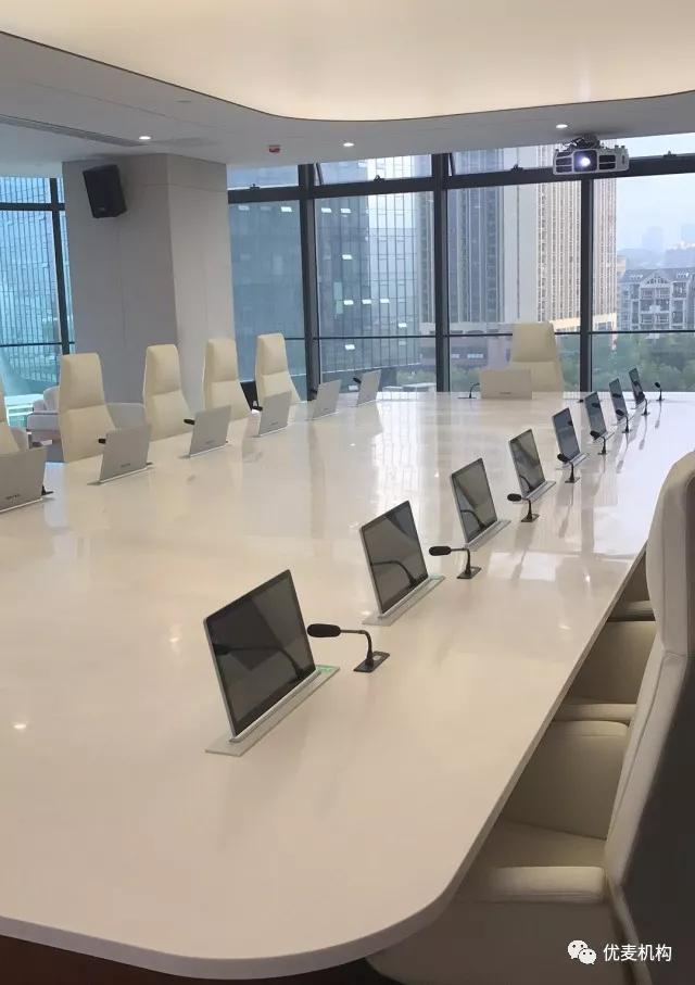 本次项目优麦为此企业打造一间极具现代风格的交互式智能会议室,会议室采用YMIOO无纸化嵌入式表决会议音响系统,系统采用17.3寸的液晶高清触摸显示屏和嵌入式手拉手话筒无缝结合,完成整套时尚高级的会议功能新体验。减少了传统话筒布线的复杂性,能够更有效的控制会场的秩序。采用数字音频中心心其内部预置话筒和扬声器的频响曲线,避免调试不精确产生的声音失真啸叫,程序内置了会议、演唱、电影等多个场景模式一键切换;