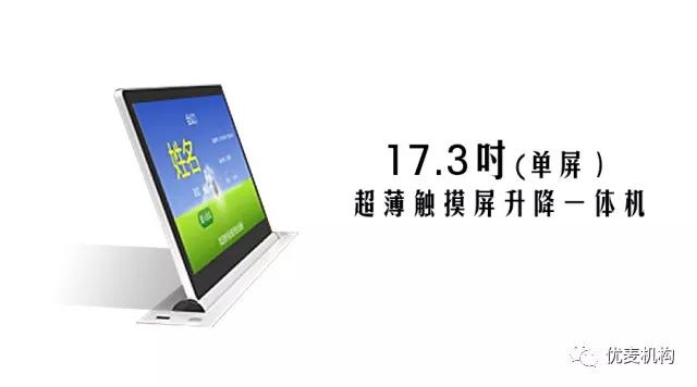 17.3吋高清显示IPS高清真彩屏,钢化玻璃;降器面板推荐颜色:航空铝银,经典亚光黑;升降器支持自动仰角12度,保证显示器人体工程学最佳观看视角与触控角度,无缝圆轴一体连接。保证各个角度的美观,完美视角。