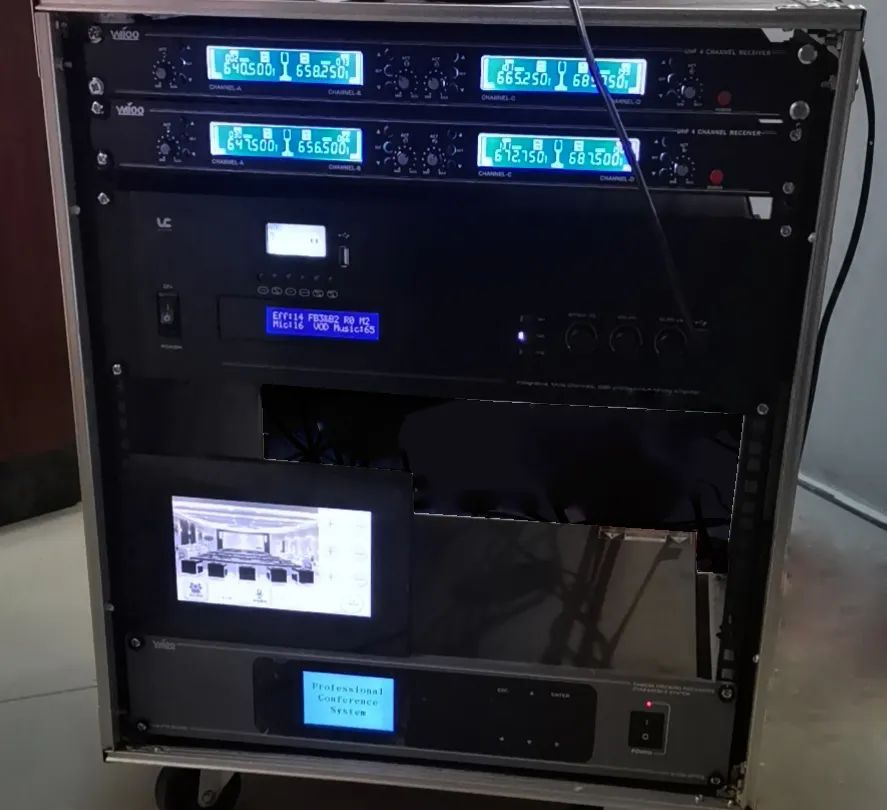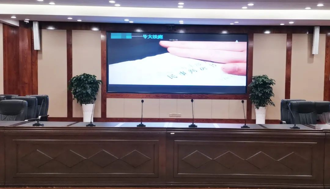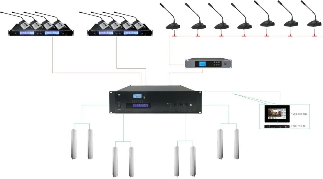 某省人民法院项目改造工程,选用的是优麦MK400会议音频系统,配置包括带7吋触摸屏的四通道有源音频处理器1台、手拉手会议话筒10只、一拖四无线会议话筒2套、多功能音箱8只以及1台数字手拉手会议主机。