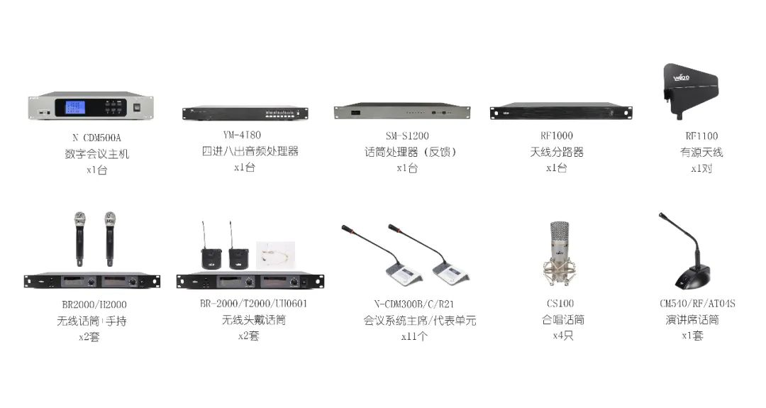 其中,多功能厅是整个项目的亮点设计。这个约800平米的多功能厅,具备开会、演唱功能,平时用于学术报告、讲座、工作会议等。根据甲方的需求,要求声音效果做到高保真、无啸叫、不失真。为此,我方应用了优麦的全音频系统,其主要配置包括:BR-2000/H2000无线手持话筒2套,BR-2000/T2000/UH0601无线头戴话筒2套,N-CDM500A会议系统主机1台,N-CDM300B/C/R21会议系统主席/代表单元11个,CS100合唱话筒4只,CM540/RF/AT04S演讲席话筒1套,PR-680电源时序器2套,DSP88数字音频矩阵1台,YM-4I8O四进八出音频处理器 1台,SM-S1200话筒处理器(反馈)1台,PA4800四通道功放2台,PA-2800两通道功放5台。