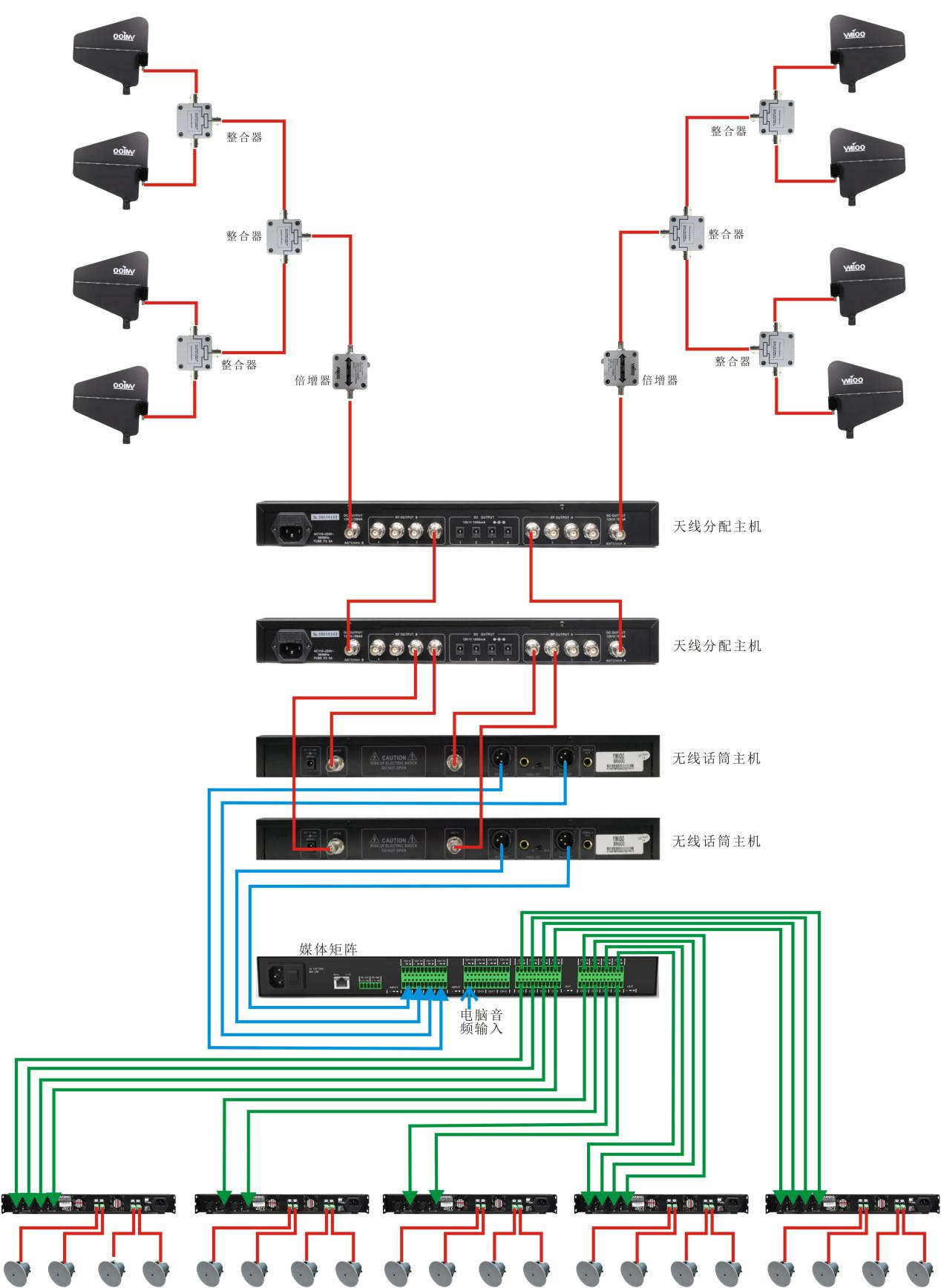 系统还采用了2套BR600/T600/UL02 一拖二无线领夹话筒,2台RF1000 UHF天线分配主机,4对RF1100 RF定向天线,1对RF1200 RF信号倍增器,3对RF1300 RF信号整合器。做到无线话筒信号全展厅覆盖、无死角;多种无线话筒和多种背景音乐可以送到任意一个区域,切换互不干扰。