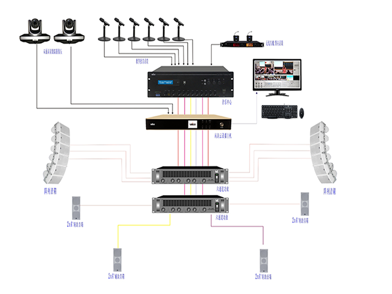3、模拟电视台录播系统采用高清图像信号传输到虚拟演播主机,经虚拟演播主机进行实时抠像、叠加虚拟背景处理,实现校园电视台录制;完成静态、动态背景实时叠加,实现校园的直播、点播、编辑;配合资源管理平台实现集中管理录播系统和教学资源共享。