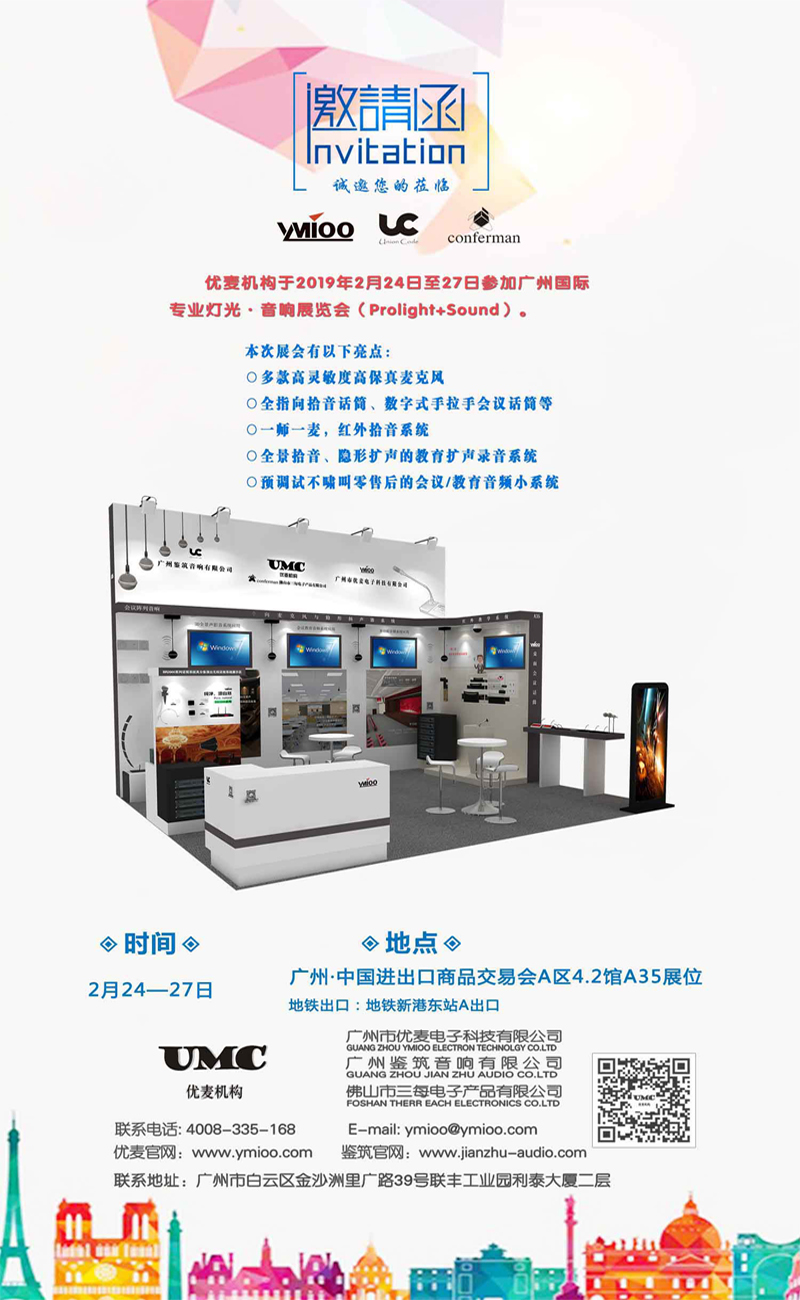 2019年广州国际专业灯光.音响展览会展将于2月24-27日在广州.中国进出口商品交易会举行。届时藉此平台,我司将在A区4.2馆A35展位上展示最新产品:高灵敏度全向拾音话筒、高灵敏度数字手拉手会议话筒、隐形音响、红外拾音系统等